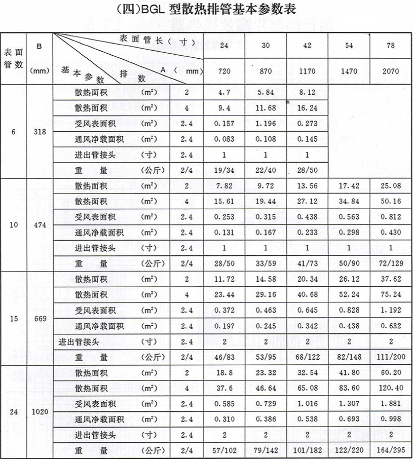 BGL型不銹鋼散熱排管,可分二排、四排、六排,當(dāng)然也能制單排,以及其他非標(biāo)形式,每種型號(hào)均有大小不同的規(guī)格,在此只標(biāo)常規(guī)型號(hào)、規(guī)格。其中外殼、無(wú)縫不銹鋼管¢18×2m/m均用1Cr18Ni9Ti材料,其翅片管用鋁軋制而成,翅片管外徑為¢38mm,根徑為¢19mm,其片高為9.5mm,片距為R片(3m/m),翅片管呈螺旋狀。